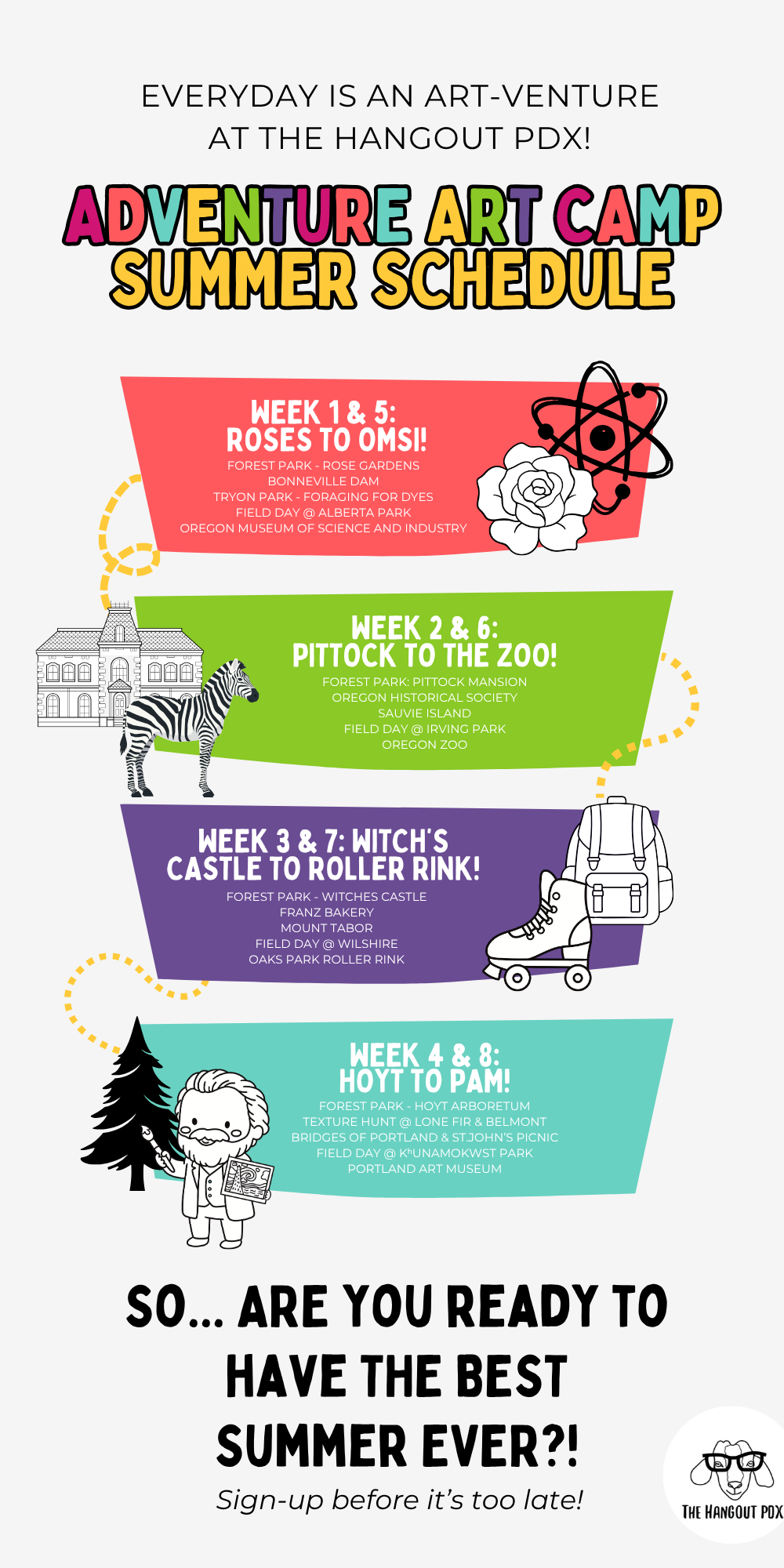 Join the Hangout team for our Adventure Art Camp, an adventure-style Summer Camp that takes kids out of the studio and introduces them to the amazing art that lives in our own backyard! All the while, campers will draw inspiration from their adventures in their handmade sketchbooks via graphite, charcoal, pastel, and watercolor mediums!